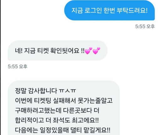 언제든 문의주시면 원하시는 티켓팅 성공해드리도록 최선을 다하겠습니다.